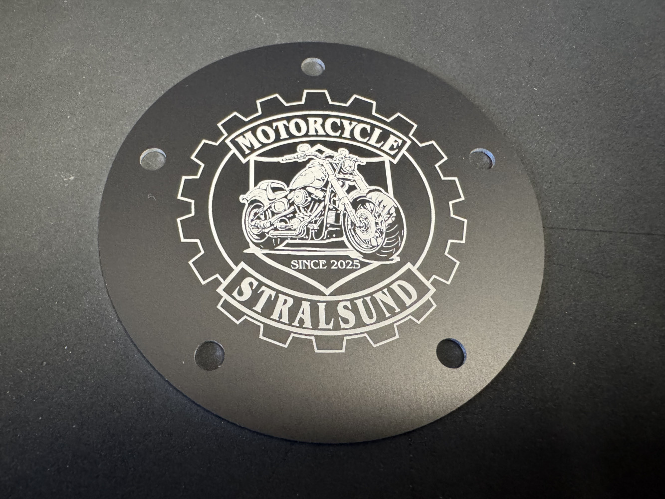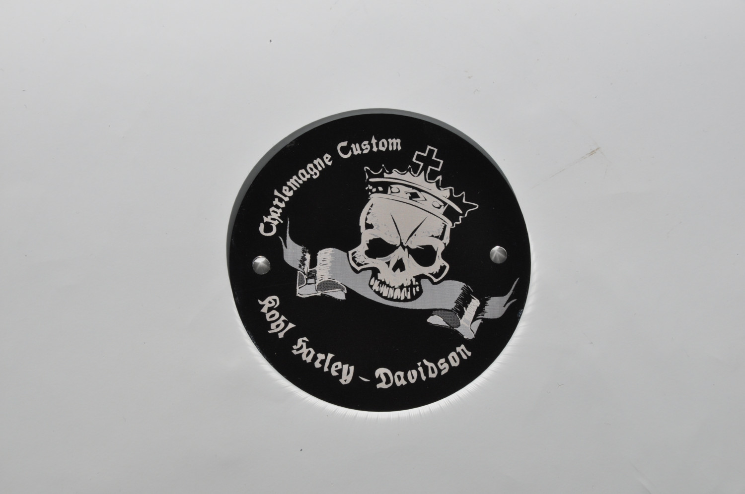 CNC-gefräst aus Aluminium, schwarz eloxiert mit hochwertiger, dauerhafter Lasergravur passend für HD-Evo®, Shovel®, Twin Cam®, Sportster®, Buell®, mit zwei Bohrungen (5 Bohrungen Twin Cam®) zur Befestigung mit Nieten oder Schrauben (sind nicht in der Lieferung enthalten)